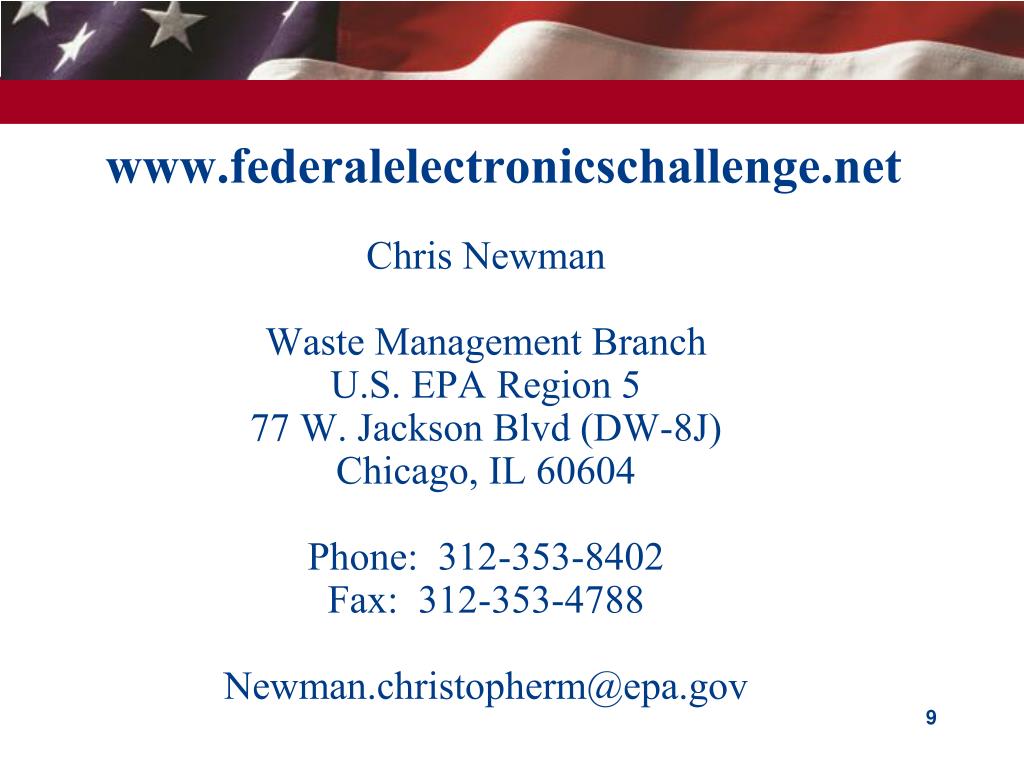 www.federalelectronicschallenge.net Chris Newman Waste Management Branch U.S. EPA Region 5 77 W. Jackson Blvd (DW-8J) Chicago, IL 60604 Phone: 312-353-8402 Fax: 312-353-4788 Newman.christopherm@epa.gov