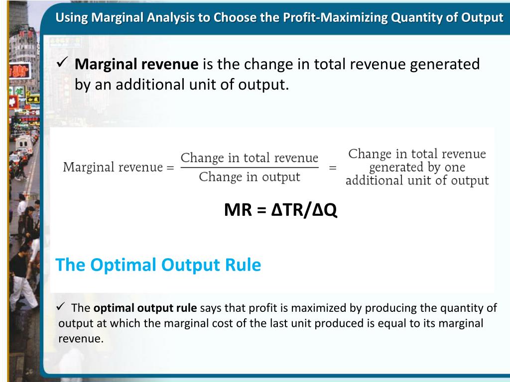 Using Marginal Analysis to Choose the Profit-Maximizing Quantity of Output MR = ∆TR/∆Q • The Optimal Output Rule • The optimal output rule says that profit is maximized by producing the quantity of output at which the marginal cost of the last unit produced is equal to its marginal revenue. • Marginal revenue is the change in total revenue generated by an additional unit of output.