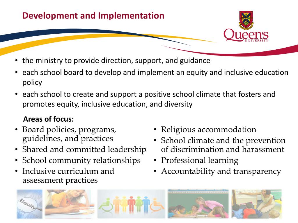 Development and Implementation • the ministry to provide direction, support, and guidance • each school board to develop and implement an equity and inclusive education policy • each school to create and support a positive school climate that fosters and promotes equity, inclusive education, and diversity Areas of focus: • Board policies, programs, guidelines, and practices • Shared and committed leadership • School community relationships • Inclusive curriculum and assessment practices • Religious accommodation • School climate and the prevention of discrimination and harassment • Professional learning • Accountability and transparency