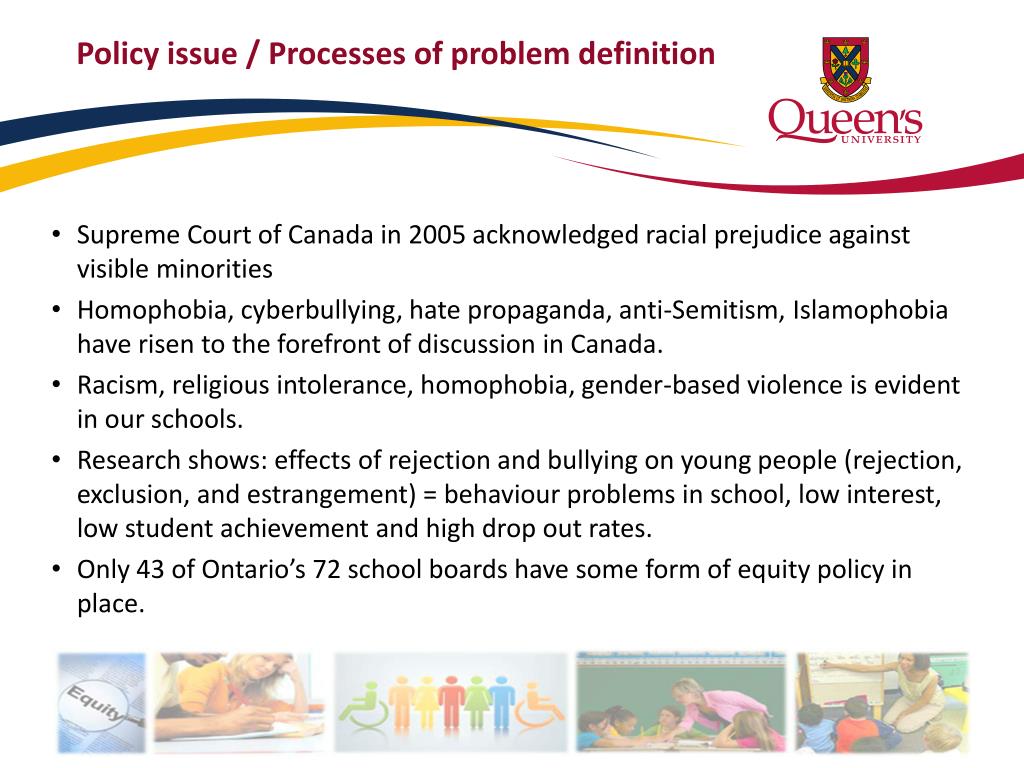 Policy issue / Processes of problem definition • Supreme Court of Canada in 2005 acknowledged racial prejudice against visible minorities • Homophobia, cyberbullying, hate propaganda, anti-Semitism, Islamophobia have risen to the forefront of discussion in Canada. • Racism, religious intolerance, homophobia, gender-based violence is evident in our schools. • Research shows: effects of rejection and bullying on young people (rejection, exclusion, and estrangement) = behaviour problems in school, low interest, low student achievement and high drop out rates. • Only 43 of Ontario’s 72 school boards have some form of equity policy in place.
