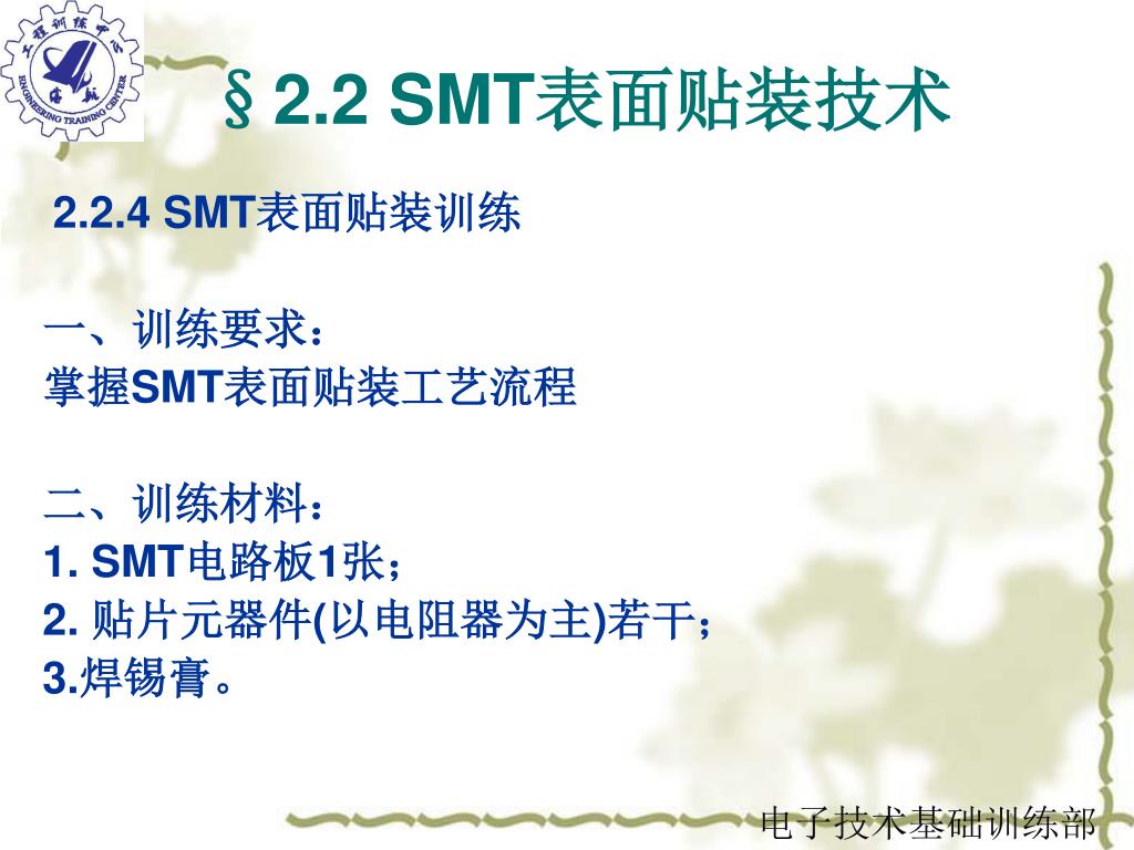 §2.2 SMT表面贴装技术 2.2.4 SMT表面贴装训练 一、训练要求: 掌握SMT表面贴装工艺流程 二、训练材料: 1. SMT电路板1张; 2. 贴片元器件(以电阻器为主)若干; 3.焊锡膏。 电子技术基础训练部