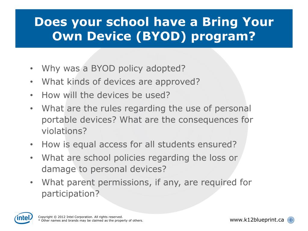 Does your school have a Bring Your Own Device (BYOD) program? Why was a BYOD policy adopted? What kinds of devices are approved? How will the devices be used? What are the rules regarding the use of personal portable devices? What are the consequences for violations? How is equal access for all students ensured? What are school policies regarding the loss or damage to personal devices? What parent permissions, if any, are required for participation?