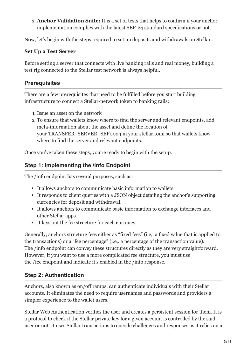 3. Anchor Validation Suite: It is a set of tests that helps to confirm if your anchor implementation complies with the latest SEP-24 standard specifications or not. Now, let’s begin with the steps required to set up deposits and withdrawals on Stellar. Set Up a Test Server Before setting a server that connects with live banking rails and real money, building a test rig connected to the Stellar test network is always helpful. Prerequisites There are a few prerequisites that need to be fulfilled before you start building infrastructure to connect a Stellar-network token to banking rails: 1. Issue an asset on the network 2. To ensure that wallets know where to find the server and relevant endpoints, add meta-information about the asset and define the location of your TRANSFER_SERVER_SEP0024 in your stellar.toml so that wallets know where to find the server and relevant endpoints. Once you’ve taken these steps, you’re ready to begin with the setup. Step 1: Implementing the /info Endpoint The /info endpoint has several purposes, such as: It allows anchors to communicate basic information to wallets. It responds to client queries with a JSON object detailing the anchor’s supporting currencies for deposit and withdrawal. It allows anchors to communicate basic information to exchange interfaces and other Stellar apps. It lays out the fee structure for each currency. Generally, anchors structure fees either as “fixed fees” (i.e,. a fixed value that is applied to the transactions) or a “fee percentage” (i.e,. a percentage of the transaction value). The /info endpoint can convey these structures directly as they are very straightforward. However, if you want to use a more complicated fee structure, you must use the /fee endpoint and indicate it’s enabled in the /info response. Step 2: Authentication Anchors, also known as on/off ramps, can authenticate individuals with their Stellar accounts. It eliminates the need to require usernames and passwords and providers a simpler experience to the wallet users. Stellar Web Authentication verifies the user and creates a persistent session for them. It is a protocol to check if the Stellar private key for a given account is controlled by the said user or not. It uses Stellar transactions to encode challenges and responses as it relies on a 3/11