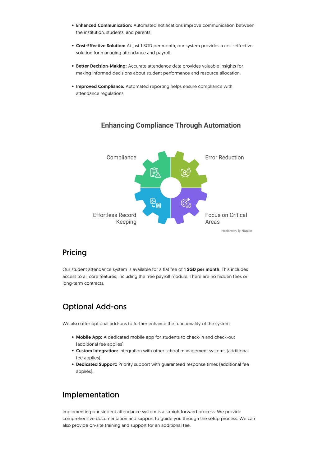 • Enhanced Communication: Automated notifications improve communication between the institution, students, and parents. • Cost-Effective Solution: At just 1 SGD per month, our system provides a cost-effective solution for managing attendance and payroll. • Better Decision-Making: Accurate attendance data provides valuable insights for making informed decisions about student performance and resource allocation. • Improved Compliance: Automated reporting helps ensure compliance with attendance regulations. Enhancing Compliance Through Automation Compliance Error Reduction Effortless Record Focus on Critical Areas Keeping Pricing Our student attendance system is available for a flat fee of 1 SGD per month. This includes access to all core features, including the free payroll module. There are no hidden fees or long-term contracts. Optional Add-ons We also offer optional add-ons to further enhance the functionality of the system: • Mobile App: A dedicated mobile app for students to check-in and check-out (additional fee applies). • Custom Integration: Integration with other school management systems (additional fee applies). • Dedicated Support: Priority support with guaranteed response times (additional fee applies). Implementation Implementing our student attendance system is a straightforward process. We provide comprehensive documentation and support to guide you through the setup process. We can also provide on-site training and support for an additional fee.