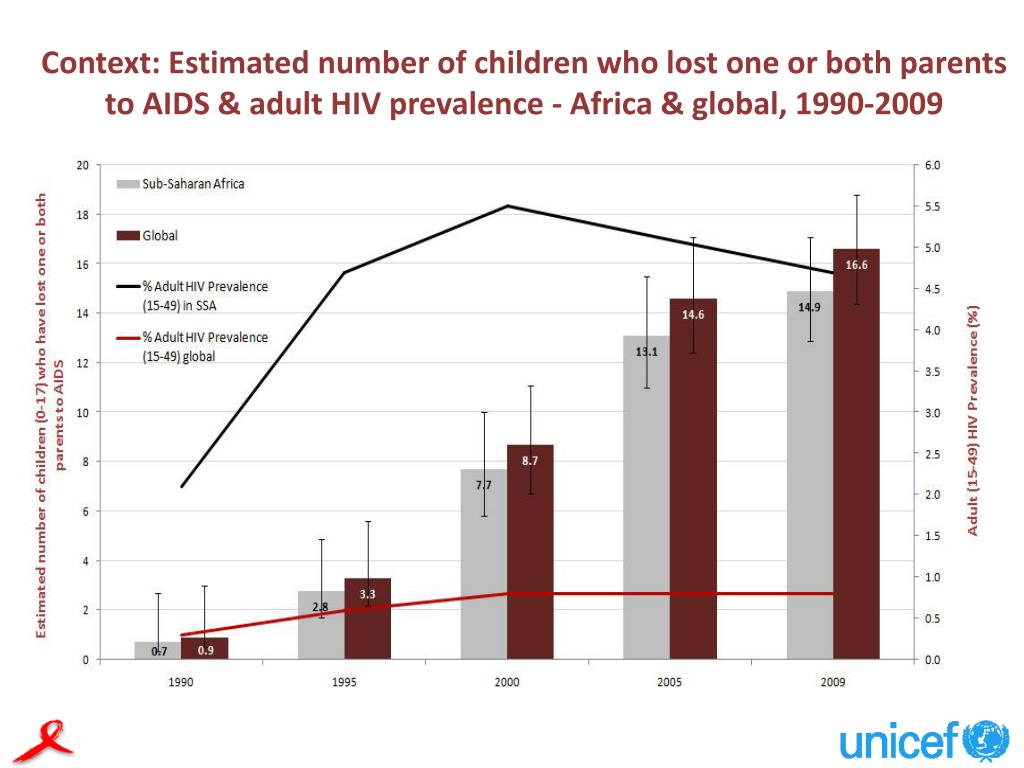 Context: Estimated number of children who lost one or both parents to AIDS & adult HIV prevalence - Africa & global, 1990-2009