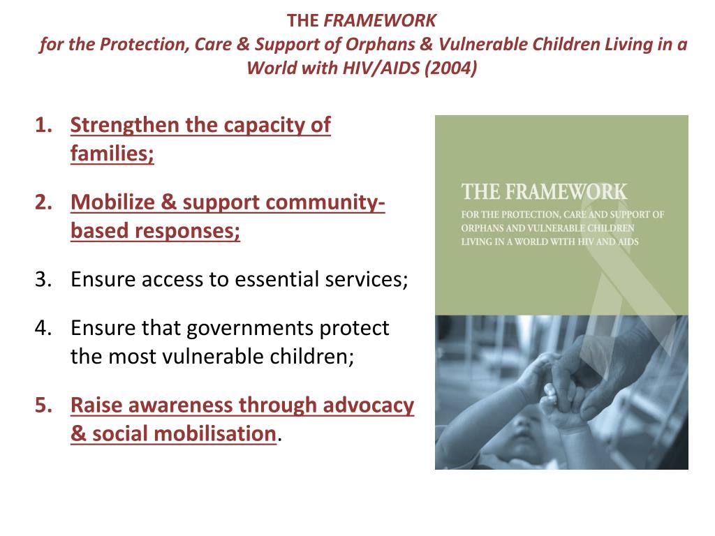 THE FRAMEWORK for the Protection, Care & Support of Orphans & Vulnerable Children Living in a World with HIV/AIDS (2004) • Strengthen the capacity of families; • Mobilize & support community-based responses; • Ensure access to essential services; • Ensure that governments protect the most vulnerable children; • Raise awareness through advocacy & social mobilisation.