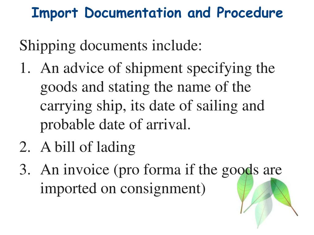 Import Documentation and Procedure Shipping documents include: • An advice of shipment specifying the goods and stating the name of the carrying ship, its date of sailing and probable date of arrival. • A bill of lading • An invoice (pro forma if the goods are imported on consignment)