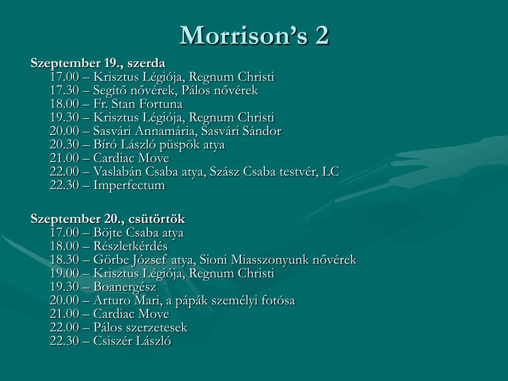 Morrison’s 2 Szeptember 19., szerda17.00 – Krisztus Légiója, Regnum Christi17.30 – Segítő nővérek, Pálos nővérek18.00 – Fr. Stan Fortuna19.30 – Krisztus Légiója, Regnum Christi20.00 – Sasvári Annamária, Sasvári Sándor20.30 – Bíró László püspök atya 21.00 – Cardiac Move22.00 – Vaslabán Csaba atya, Szász Csaba testvér, LC 22.30 – Imperfectum Szeptember 20., csütörtök17.00 – Böjte Csaba atya18.00 – Részletkérdés18.30 – Görbe József atya, Sioni Miasszonyunk nővérek19.00 – Krisztus Légiója, Regnum Christi19.30 – Boanergész20.00 – Arturo Mari, a pápák személyi fotósa21.00 – Cardiac Move22.00 – Pálos szerzetesek 22.30 – Csiszér László