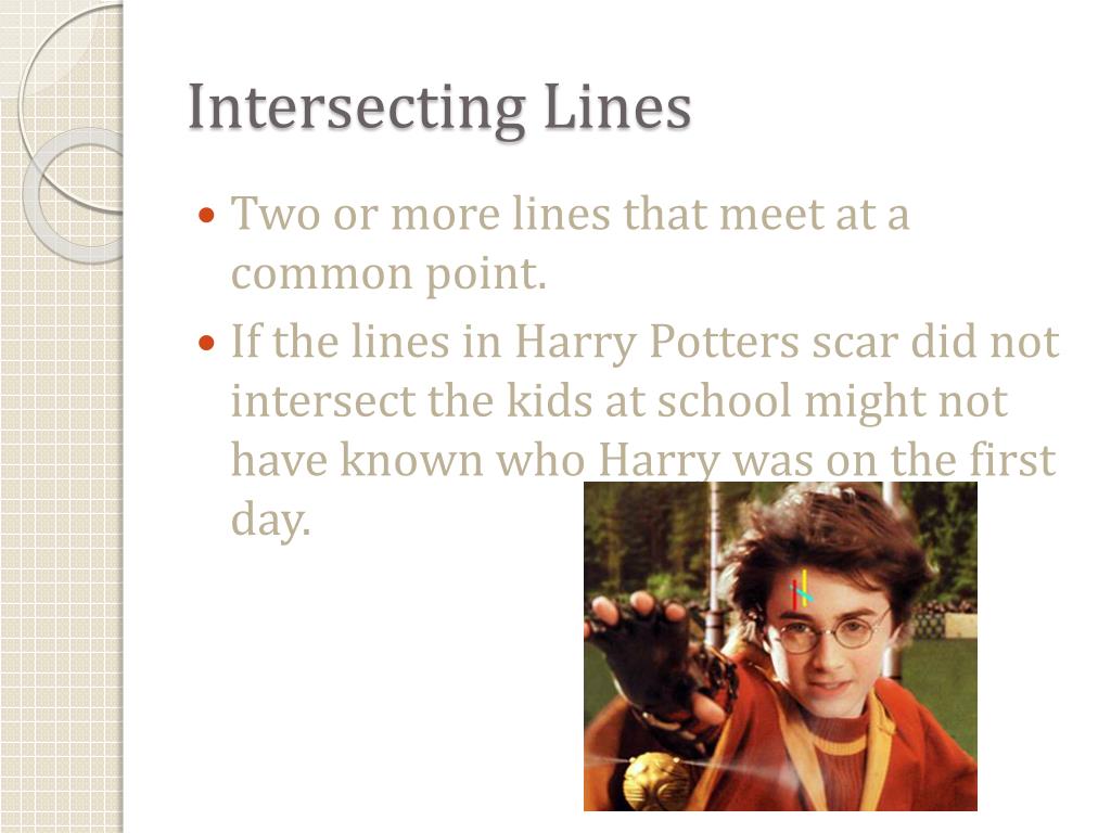 Intersecting Lines • Two or more lines that meet at a common point. • If the lines in Harry Potters scar did not intersect the kids at school might not have known who Harry was on the first day.