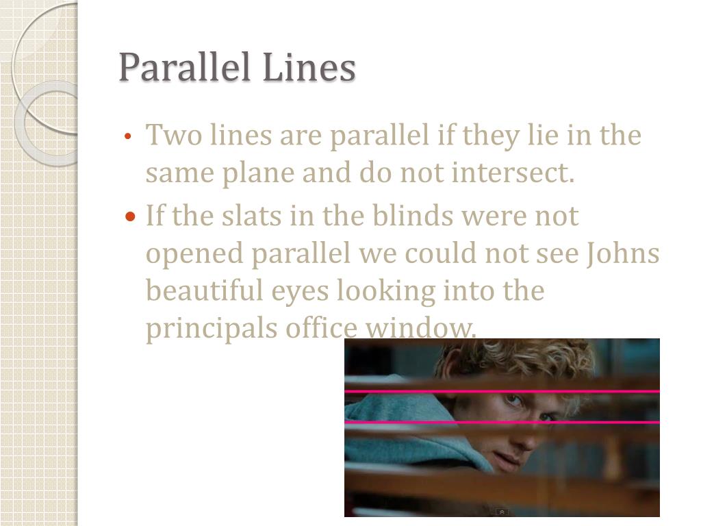 Parallel Lines • Two lines are parallel if they lie in the same plane and do not intersect. • If the slats in the blinds were not opened parallel we could not see Johns beautiful eyes looking into the principals office window.