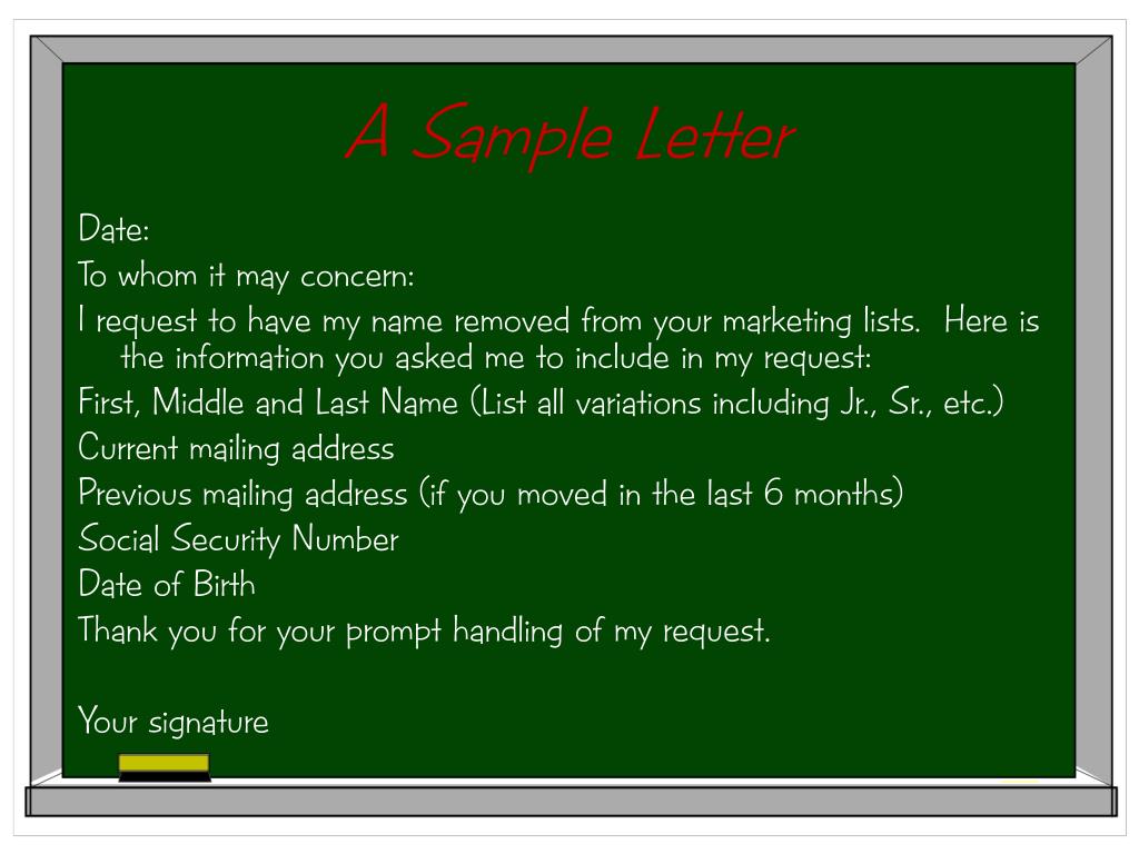 A Sample Letter Date: To whom it may concern: I request to have my name removed from your marketing lists. Here is the information you asked me to include in my request: First, Middle and Last Name (List all variations including Jr., Sr., etc.) Current mailing address Previous mailing address (if you moved in the last 6 months) Social Security Number Date of Birth Thank you for your prompt handling of my request. Your signature
