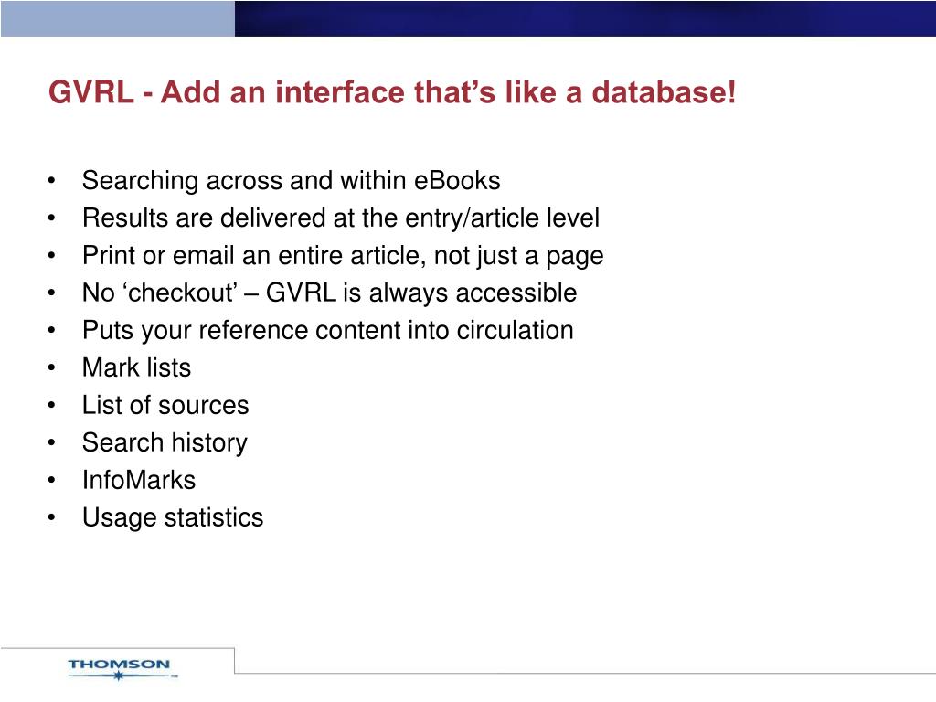 GVRL - Add an interface that’s like a database! • Searching across and within eBooks • Results are delivered at the entry/article level • Print or email an entire article, not just a page • No ‘checkout’ – GVRL is always accessible • Puts your reference content into circulation • Mark lists • List of sources • Search history • InfoMarks • Usage statistics