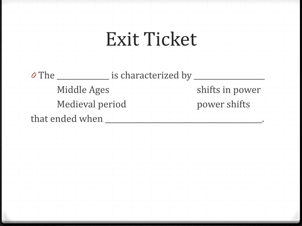 Exit Ticket • The ______________ is characterized by ___________________ Middle Ages shifts in power Medieval period power shifts that ended when __________________________________________.