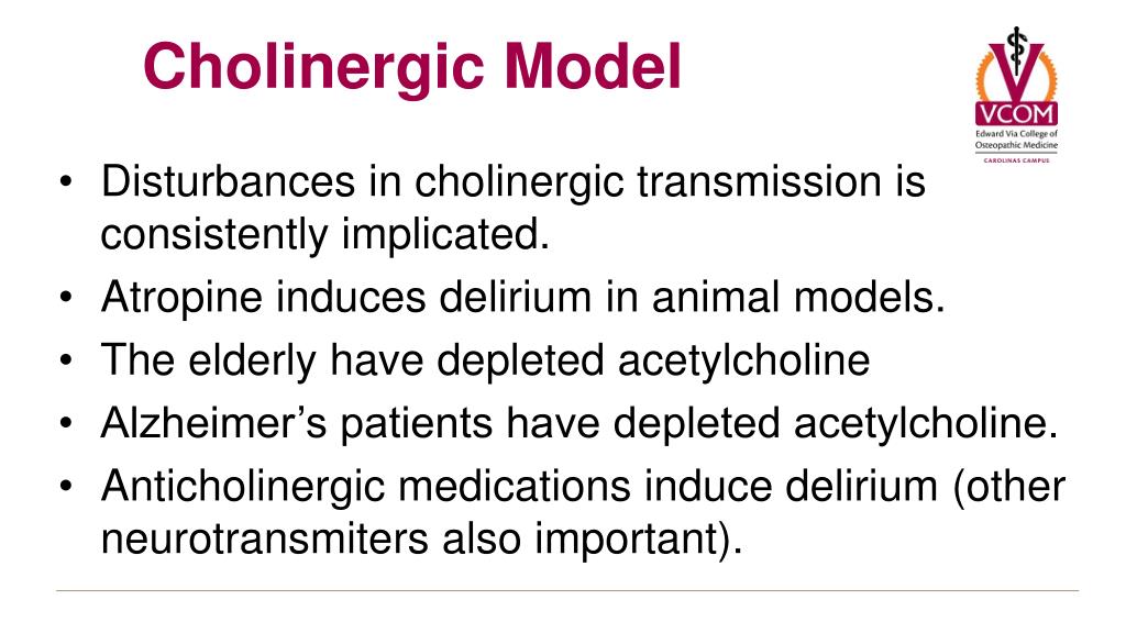 Disturbances in cholinergic transmission is consistently implicated. Atropine induces delirium in animal models. The elderly have depleted acetylcholine Alzheimer’s patients have depleted acetylcholine. Anticholinergic medications induce delirium (other neurotransmiters also important). Cholinergic Model