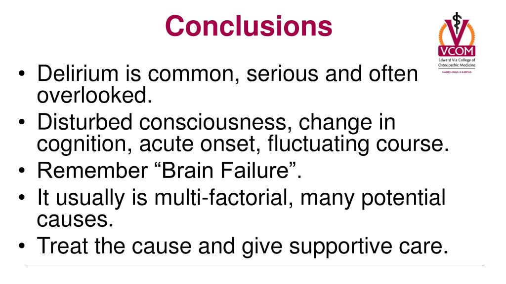 Delirium is common, serious and often overlooked. Disturbed consciousness, change in cognition, acute onset, fluctuating course. Remember “Brain Failure”. It usually is multi-factorial, many potential causes. Treat the cause and give supportive care. Conclusions