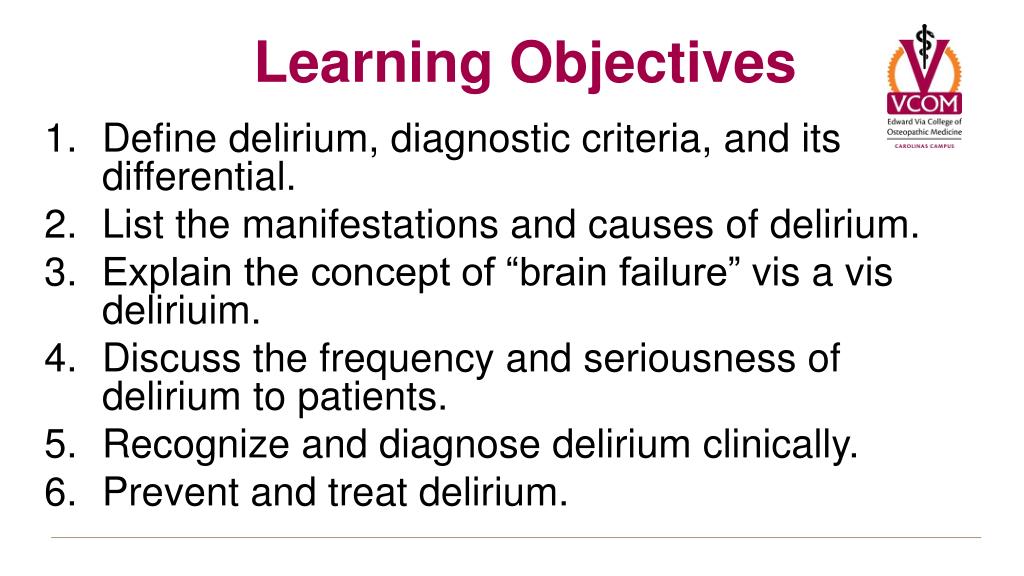 Define delirium, diagnostic criteria, and its differential. List the manifestations and causes of delirium. Explain the concept of “brain failure” vis a visdeliriuim. Discuss the frequency and seriousness of delirium to patients. Recognize and diagnose delirium clinically. Prevent and treat delirium. Learning Objectives