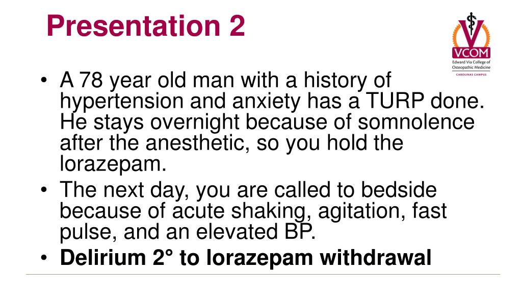 A 78 year old man with a history of hypertension and anxiety has a TURP done. He stays overnight because of somnolence after the anesthetic, so you hold the lorazepam. The next day, you are called to bedside because of acute shaking, agitation, fast pulse, and an elevated BP. Delirium 2° to lorazepam withdrawal Presentation 2