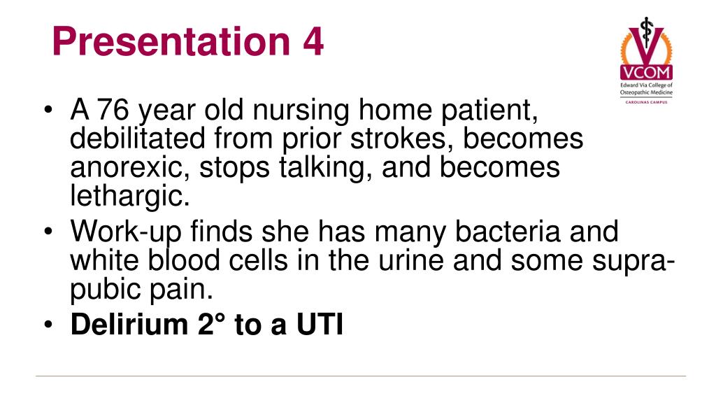 A 76 year old nursing home patient, debilitated from prior strokes, becomes anorexic, stops talking, and becomes lethargic. Work-up finds she has many bacteria and white blood cells in the urine and some supra-pubic pain. Delirium 2° to a UTI Presentation 4