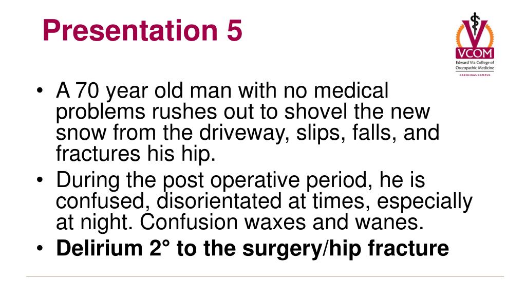 A 70 year old man with no medical problems rushes out to shovel the new snow from the driveway, slips, falls, and fractures his hip. During the post operative period, he is confused, disorientated at times, especially at night. Confusion waxes and wanes. Delirium 2° to the surgery/hip fracture Presentation 5