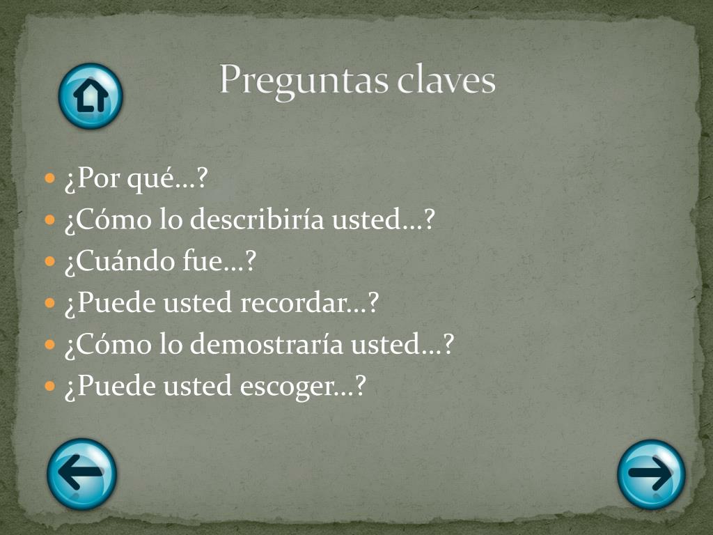 Preguntas claves • ¿Por qué…? • ¿Cómo lo describiría usted…? • ¿Cuándo fue…? • ¿Puede usted recordar…? • ¿Cómo lo demostraría usted…? • ¿Puede usted escoger…?