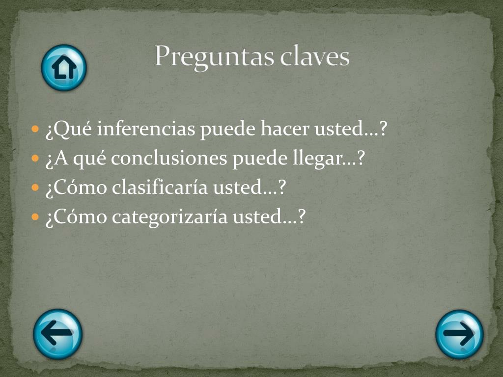 Preguntas claves • ¿Qué inferencias puede hacer usted…? • ¿A qué conclusiones puede llegar…? • ¿Cómo clasificaría usted…? • ¿Cómo categorizaría usted…?