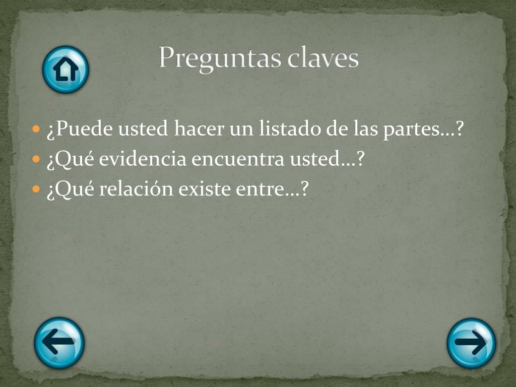 Preguntas claves • ¿Puede usted hacer un listado de las partes…? • ¿Qué evidencia encuentra usted…? • ¿Qué relación existe entre…?