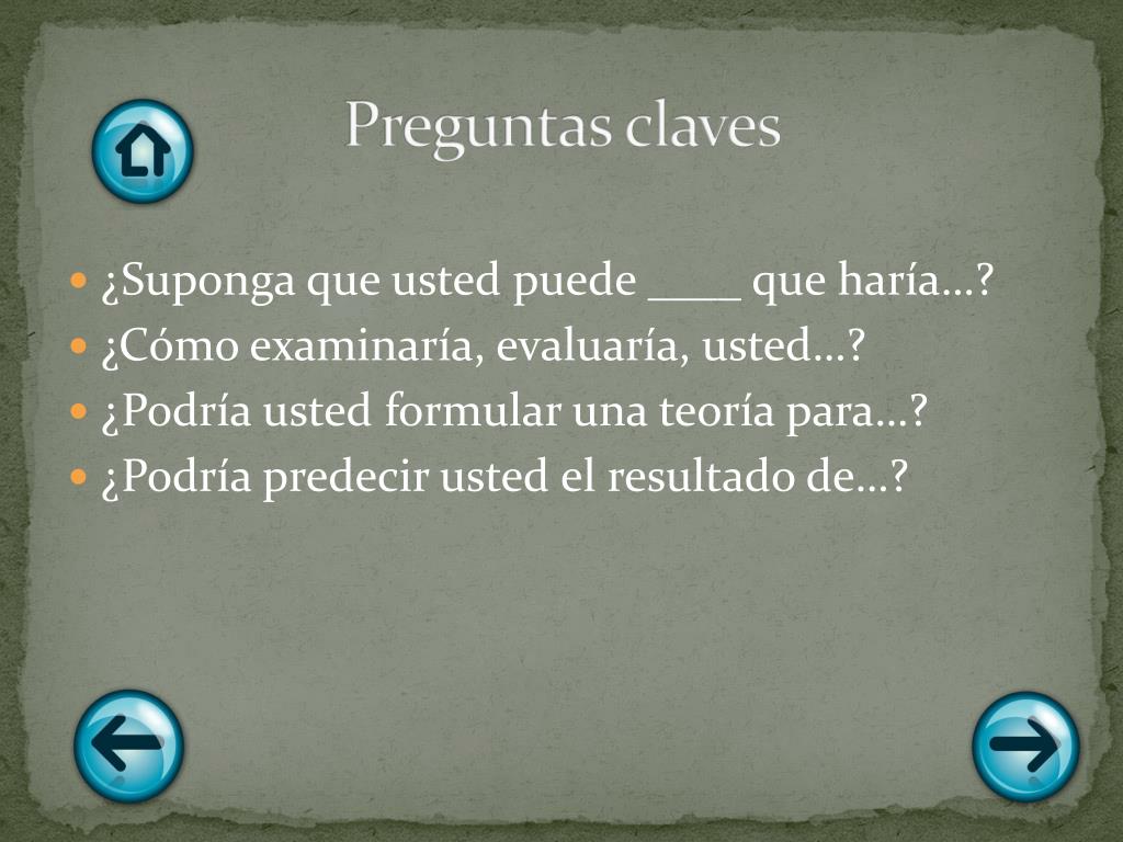 Preguntas claves • ¿Suponga que usted puede ____ que haría…? • ¿Cómo examinaría, evaluaría, usted…? • ¿Podría usted formular una teoría para…? • ¿Podría predecir usted el resultado de…?
