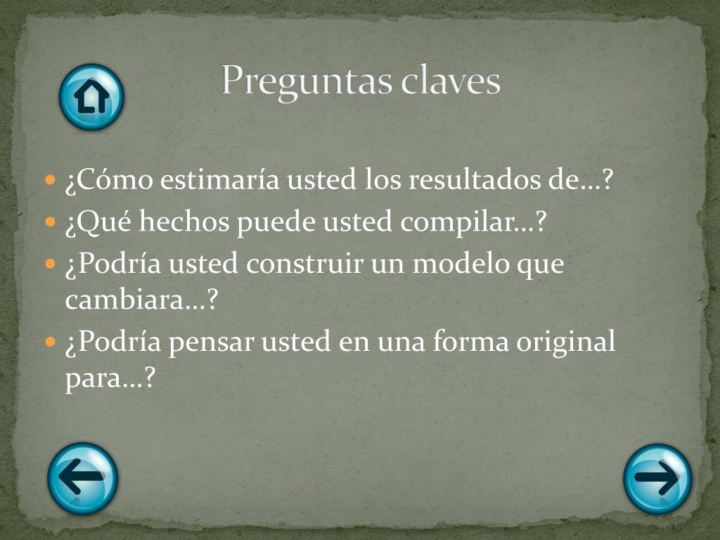 Preguntas claves • ¿Cómo estimaría usted los resultados de…? • ¿Qué hechos puede usted compilar…? • ¿Podría usted construir un modelo que cambiara…? • ¿Podría pensar usted en una forma original para…?