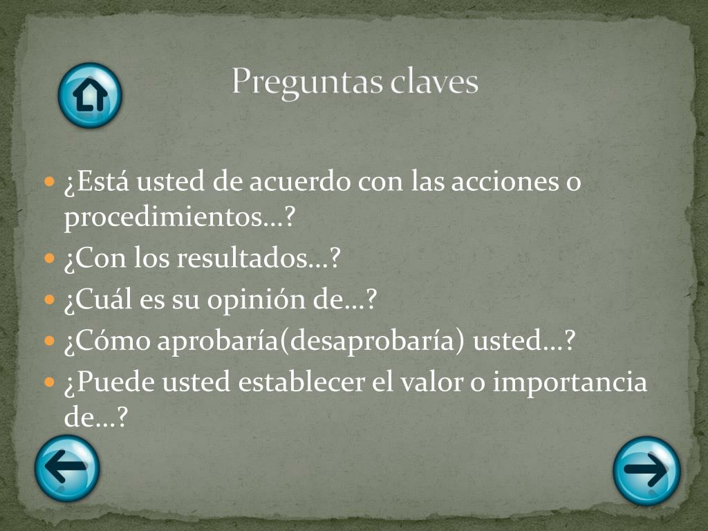 Preguntas claves • ¿Está usted de acuerdo con las acciones o procedimientos…? • ¿Con los resultados…? • ¿Cuál es su opinión de…? • ¿Cómo aprobaría(desaprobaría) usted…? • ¿Puede usted establecer el valor o importancia de…?