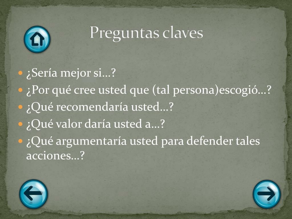 Preguntas claves • ¿Sería mejor si…? • ¿Por qué cree usted que (tal persona)escogió…? • ¿Qué recomendaría usted…? • ¿Qué valor daría usted a…? • ¿Qué argumentaría usted para defender tales acciones…?