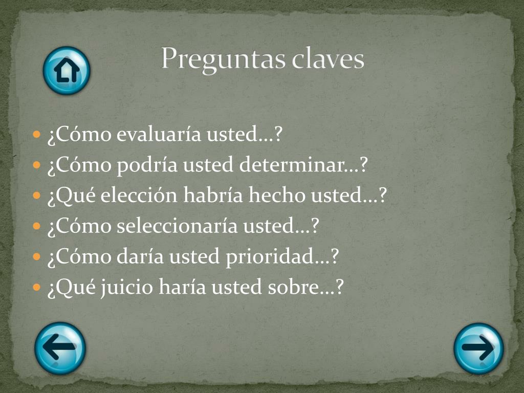 Preguntas claves • ¿Cómo evaluaría usted…? • ¿Cómo podría usted determinar…? • ¿Qué elección habría hecho usted…? • ¿Cómo seleccionaría usted…? • ¿Cómo daría usted prioridad…? • ¿Qué juicio haría usted sobre…?