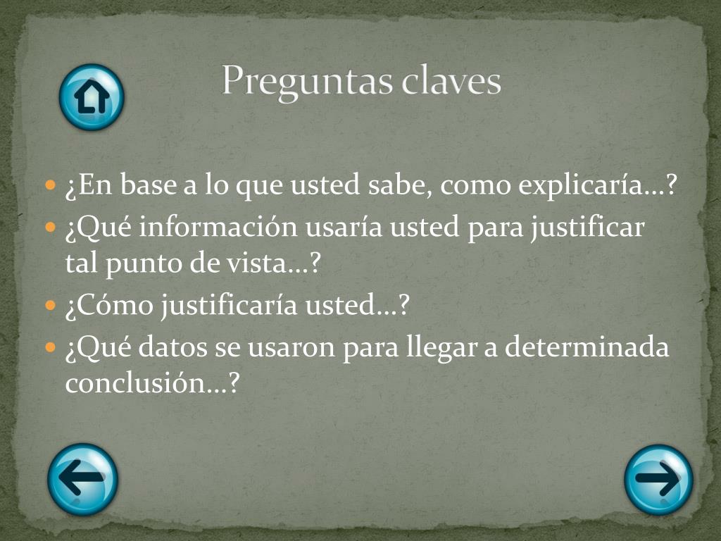 Preguntas claves • ¿En base a lo que usted sabe, como explicaría…? • ¿Qué información usaría usted para justificar tal punto de vista…? • ¿Cómo justificaría usted…? • ¿Qué datos se usaron para llegar a determinada conclusión…?