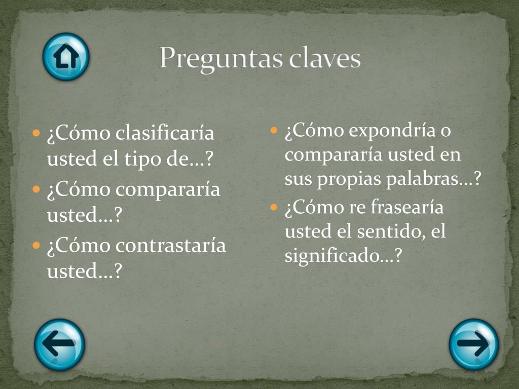Preguntas claves • ¿Cómo clasificaría usted el tipo de…? • ¿Cómo compararía usted…? • ¿Cómo contrastaría usted…? • ¿Cómo expondría o compararía usted en sus propias palabras…? • ¿Cómo re frasearía usted el sentido, el significado…?