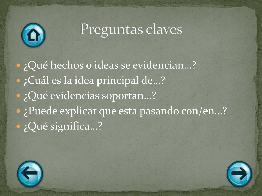 Preguntas claves • ¿Qué hechos o ideas se evidencian…? • ¿Cuál es la idea principal de…? • ¿Qué evidencias soportan…? • ¿Puede explicar que esta pasando con/en…? • ¿Qué significa…?