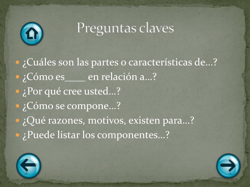Preguntas claves • ¿Cuáles son las partes o características de…? • ¿Cómo es____ en relación a…? • ¿Por qué cree usted…? • ¿Cómo se compone…? • ¿Qué razones, motivos, existen para…? • ¿Puede listar los componentes…?