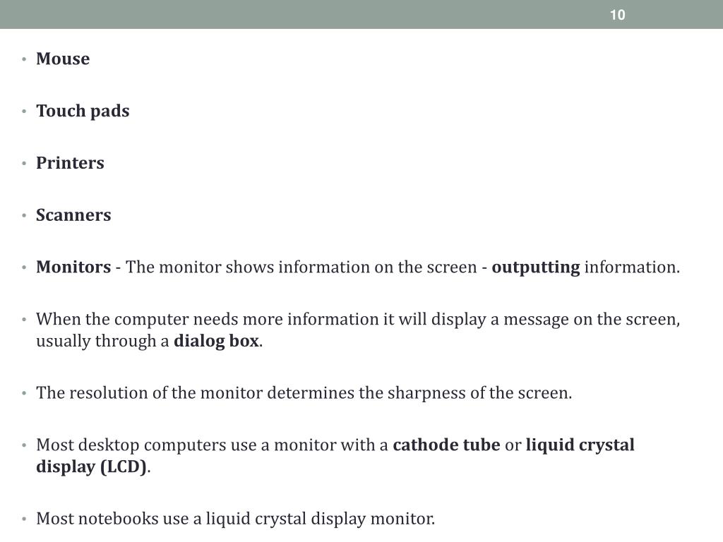 Mouse • Touch pads • Printers • Scanners • Monitors - The monitor shows information on the screen - outputting information. • When the computer needs more information it will display a message on the screen, usually through a dialog box. • The resolution of the monitor determines the sharpness of the screen. • Most desktop computers use a monitor with a cathode tube or liquid crystal display (LCD). • Most notebooks use a liquid crystal display monitor.
