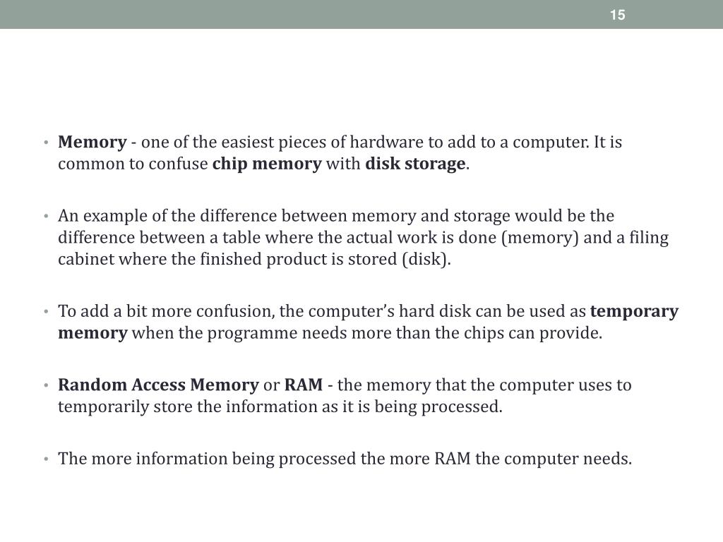 Memory - one of the easiest pieces of hardware to add to a computer. It is common to confuse chip memory with disk storage. • An example of the difference between memory and storage would be the difference between a table where the actual work is done (memory) and a filing cabinet where the finished product is stored (disk). • To add a bit more confusion, the computer’s hard disk can be used as temporary memory when the programme needs more than the chips can provide. • Random Access Memory or RAM - the memory that the computer uses to temporarily store the information as it is being processed. • The more information being processed the more RAM the computer needs.