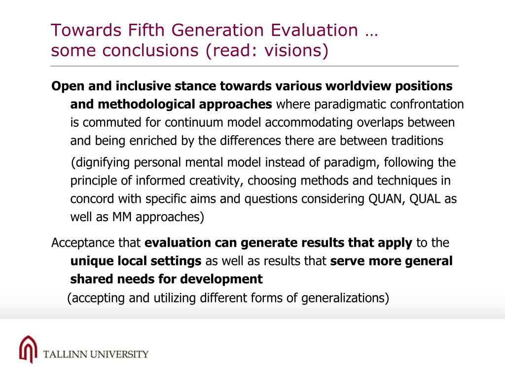 Towards Fifth Generation Evaluation …some conclusions (read: visions) Open and inclusive stance towards various worldview positions and methodological approaches where paradigmatic confrontation is commuted for continuum model accommodating overlaps between and being enriched by the differences there are between traditions (dignifying personal mental model instead of paradigm, following the principle of informed creativity, choosing methods and techniques in concord with specific aims and questions considering QUAN, QUAL as well as MM approaches) Acceptance that evaluation can generate results that apply to the unique local settings as well as results that servemore general shared needs for development (accepting and utilizing different forms of generalizations)