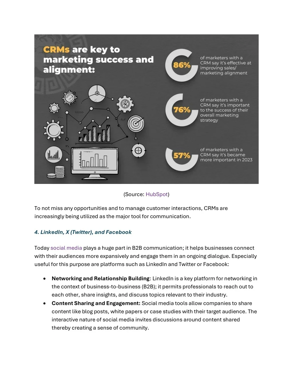 (Source: HubSpot) To not miss any opportunities and to manage customer interactions, CRMs are increasingly being utilized as the major tool for communication. 4. LinkedIn, X (Twitter), and Facebook Today social media plays a huge part in B2B communication; it helps businesses connect with their audiences more expansively and engage them in an ongoing dialogue. Especially useful for this purpose are platforms such as LinkedIn and Twitter or Facebook: •Networking and Relationship Building: LinkedIn is a key platform for networking in the context of business-to-business (B2B); it permits professionals to reach out to each other, share insights, and discuss topics relevant to their industry. •Content Sharing and Engagement: Social media tools allow companies to share content like blog posts, white papers or case studies with their target audience. The interactive nature of social media invites discussions around content shared thereby creating a sense of community.