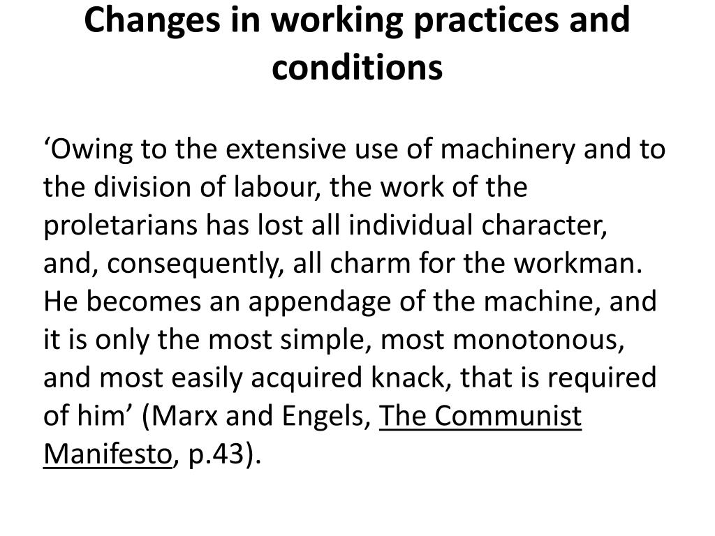 Changes in working practices and conditions ‘Owing to the extensive use of machinery and to the division of labour, the work of the proletarians has lost all individual character, and, consequently, all charm for the workman. He becomes an appendage of the machine, and it is only the most simple, most monotonous, and most easily acquired knack, that is required of him’ (Marx and Engels, The Communist Manifesto, p.43).