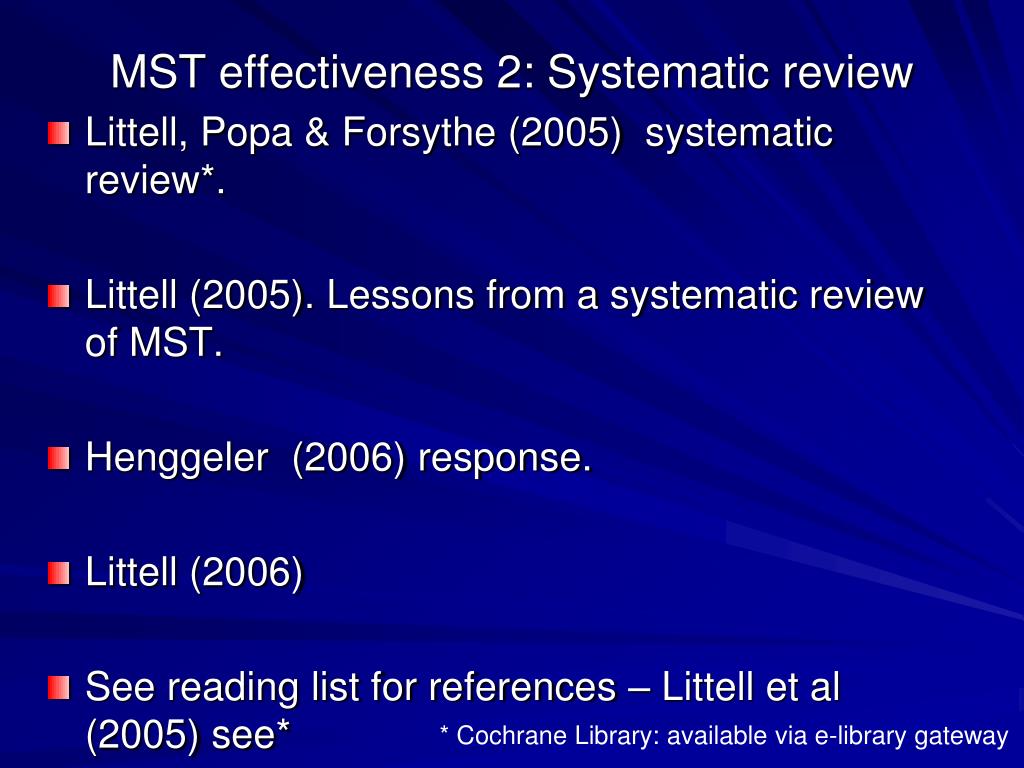 MST effectiveness 2: Systematic review • Littell, Popa & Forsythe (2005) systematic review*. • Littell (2005). Lessons from a systematic review of MST. • Henggeler (2006) response. • Littell (2006) • See reading list for references – Littell et al (2005) see* * Cochrane Library: available via e-library gateway