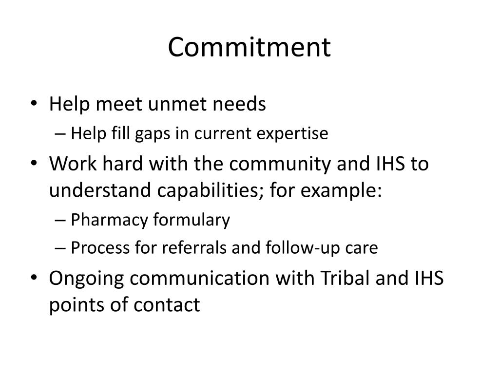 Commitment • Help meet unmet needs • Help fill gaps in current expertise • Work hard with the community and IHS to understand capabilities; for example: • Pharmacy formulary • Process for referrals and follow-up care • Ongoing communication with Tribal and IHS points of contact