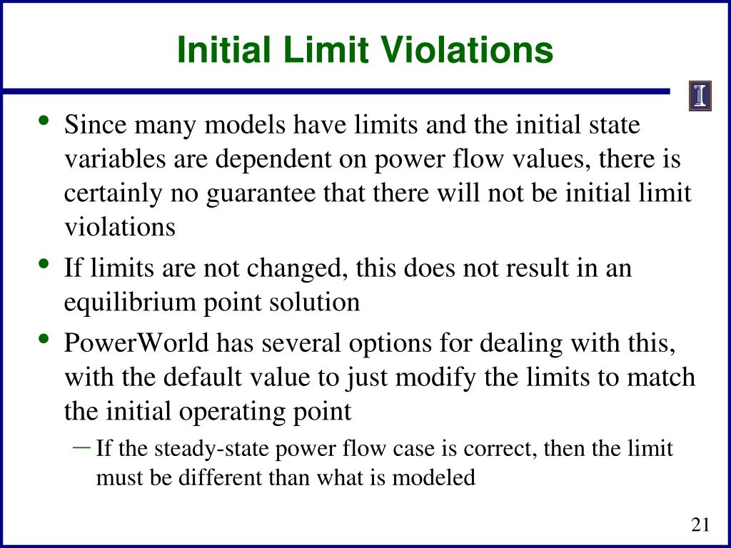 Initial Limit Violations • Since many models have limits and the initial state variables are dependent on power flow values, there is certainly no guarantee that there will not be initial limit violations • If limits are not changed, this does not result in an equilibrium point solution • PowerWorld has several options for dealing with this, with the default value to just modify the limits to match the initial operating point • If the steady-state power flow case is correct, then the limit must be different than what is modeled