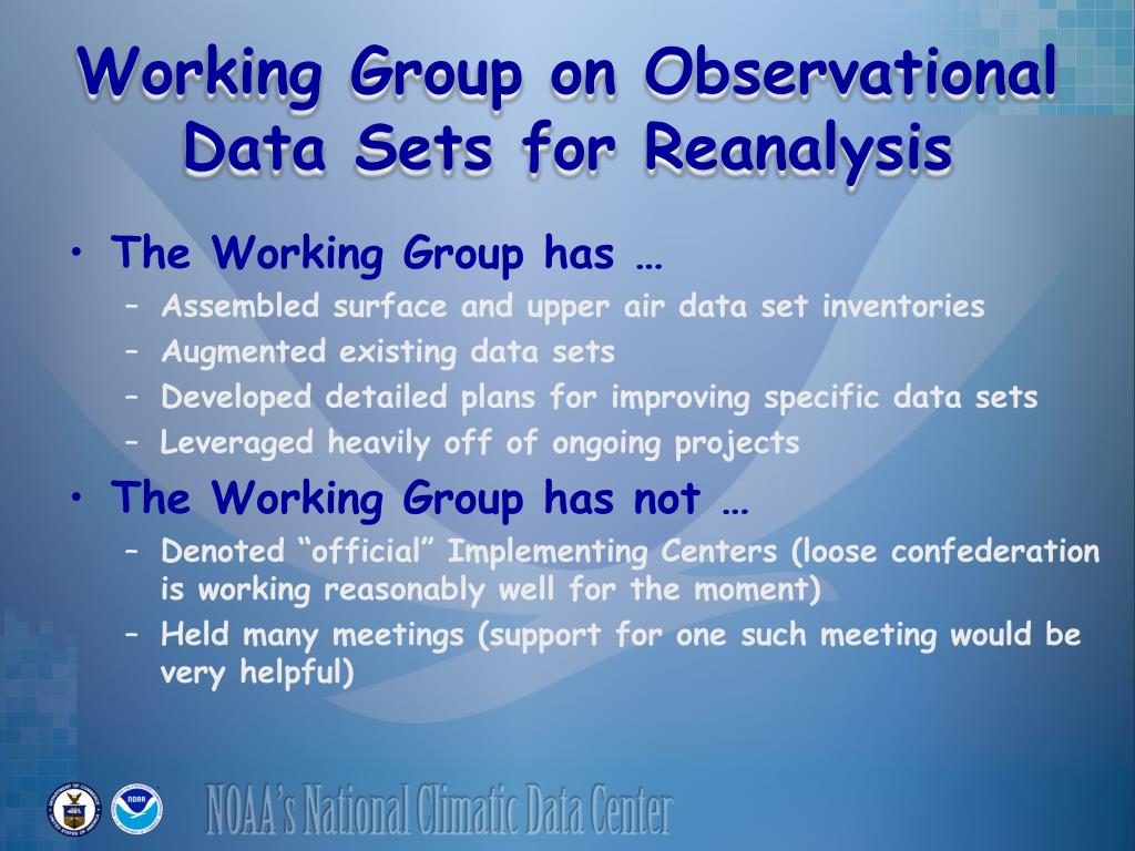 Working Group on Observational Data Sets for Reanalysis • The Working Group has … • Assembled surface and upper air data set inventories • Augmented existing data sets • Developed detailed plans for improving specific data sets • Leveraged heavily off of ongoing projects • The Working Group has not … • Denoted “official” Implementing Centers (loose confederation is working reasonably well for the moment) • Held many meetings (support for one such meeting would be very helpful)