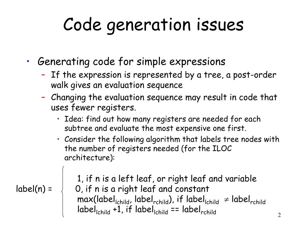 Code generation issues • Generating code for simple expressions • If the expression is represented by a tree, a post-order walk gives an evaluation sequence • Changing the evaluation sequence may result in code that uses fewer registers. • Idea: find out how many registers are needed for each subtree and evaluate the most expensive one first. • Consider the following algorithm that labels tree nodes with the number of registers needed (for the ILOC architecture): 1, if n is a left leaf, or right leaf and variable label(n) = 0, if n is a right leaf and constant max(labellchild, labelrchild), if labellchild labelrchild labellchild +1, if labellchild == labelrchild
