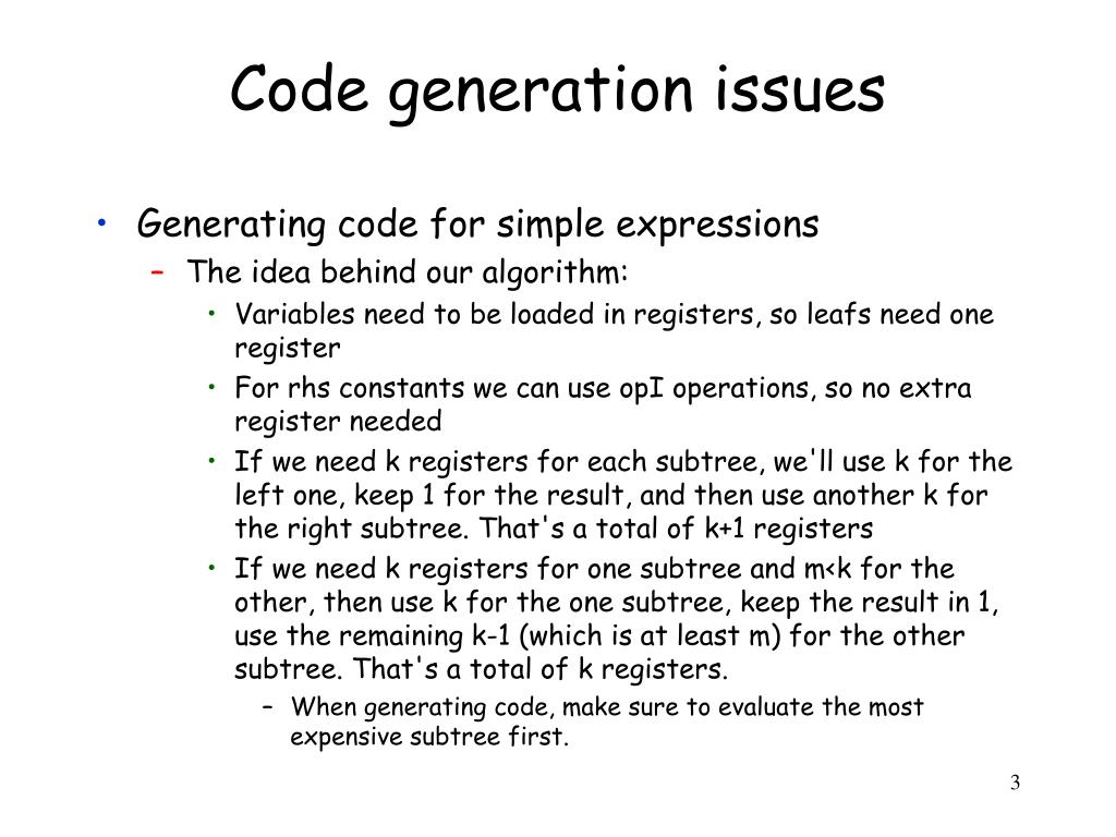 Code generation issues • Generating code for simple expressions • The idea behind our algorithm: • Variables need to be loaded in registers, so leafs need one register • For rhs constants we can use opI operations, so no extra register needed • If we need k registers for each subtree, we'll use k for the left one, keep 1 for the result, and then use another k for the right subtree. That's a total of k+1 registers • If we need k registers for one subtree and m<k for the other, then use k for the one subtree, keep the result in 1, use the remaining k-1 (which is at least m) for the other subtree. That's a total of k registers. • When generating code, make sure to evaluate the most expensive subtree first.