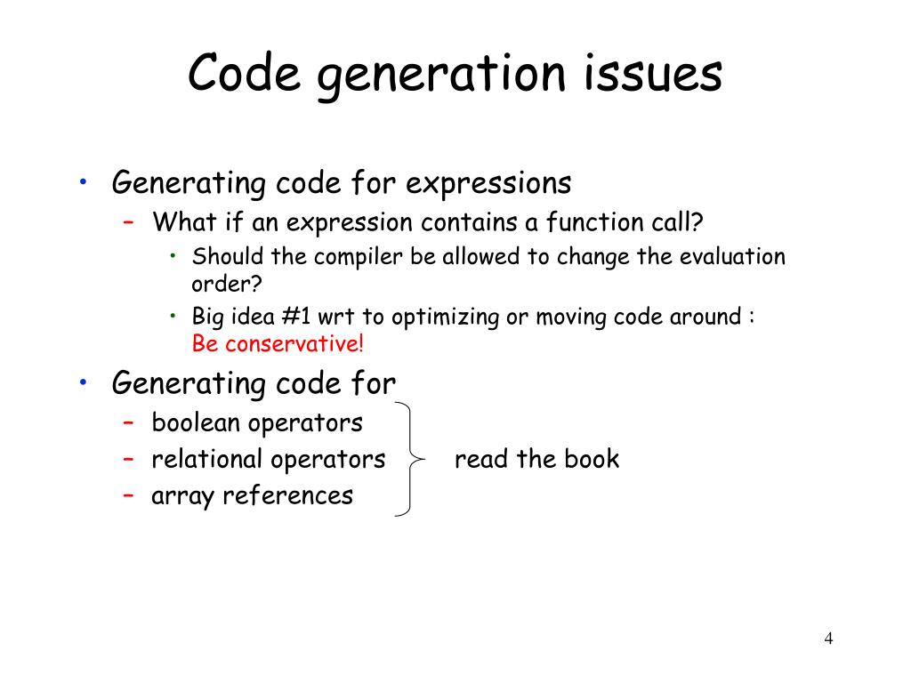 Code generation issues • Generating code for expressions • What if an expression contains a function call? • Should the compiler be allowed to change the evaluation order? • Big idea #1 wrt to optimizing or moving code around : Be conservative! • Generating code for • boolean operators • relational operators read the book • array references