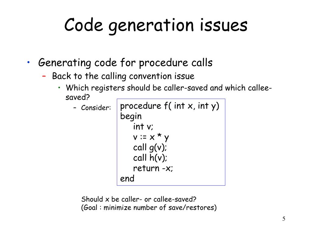 Code generation issues • Generating code for procedure calls • Back to the calling convention issue • Which registers should be caller-saved and which callee-saved? • Consider: Should x be caller- or callee-saved?(Goal : minimize number of save/restores) procedure f( int x, int y) begin int v; v := x * y call g(v); call h(v); return -x; end