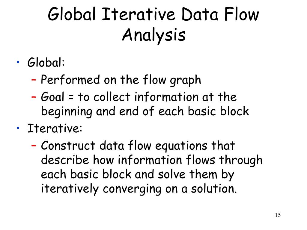 Global Iterative Data Flow Analysis • Global: • Performed on the flow graph • Goal = to collect information at the beginning and end of each basic block • Iterative: • Construct data flow equations that describe how information flows through each basic block and solve them by iteratively converging on a solution.