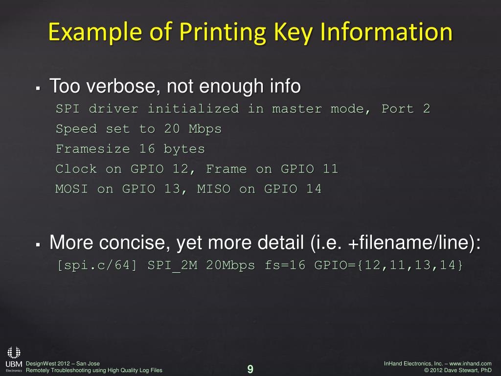 Example of Printing Key Information • Too verbose, not enough info SPI driver initialized in master mode, Port 2 Speed set to 20 Mbps Framesize 16 bytes Clock on GPIO 12, Frame on GPIO 11 MOSI on GPIO 13, MISO on GPIO 14 • More concise, yet more detail (i.e. +filename/line): [spi.c/64] SPI_2M 20Mbps fs=16 GPIO={12,11,13,14}